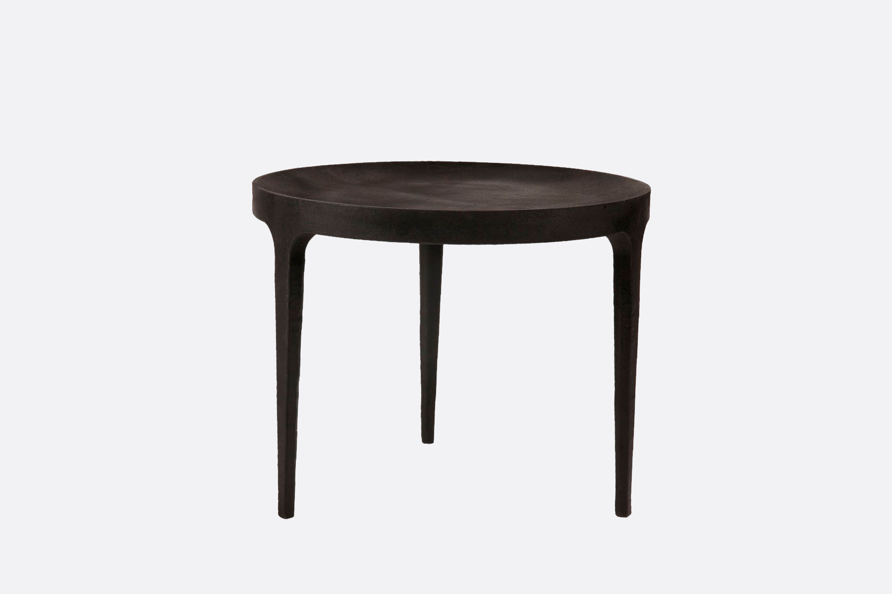 Ghost Coffee Table is a solid table in cast iron. The elegant table is casted with three pointed legs and a table top with a groove in the outline. The table is taken directly from the mould without polishing, which gives it a unique rough surface with texture of the mould. The raw table is powder coated and hand painted afterwards, which gives it a beautiful and diverse surface, with alternation between a matte and a reflective finish. No two tables have the same texture.